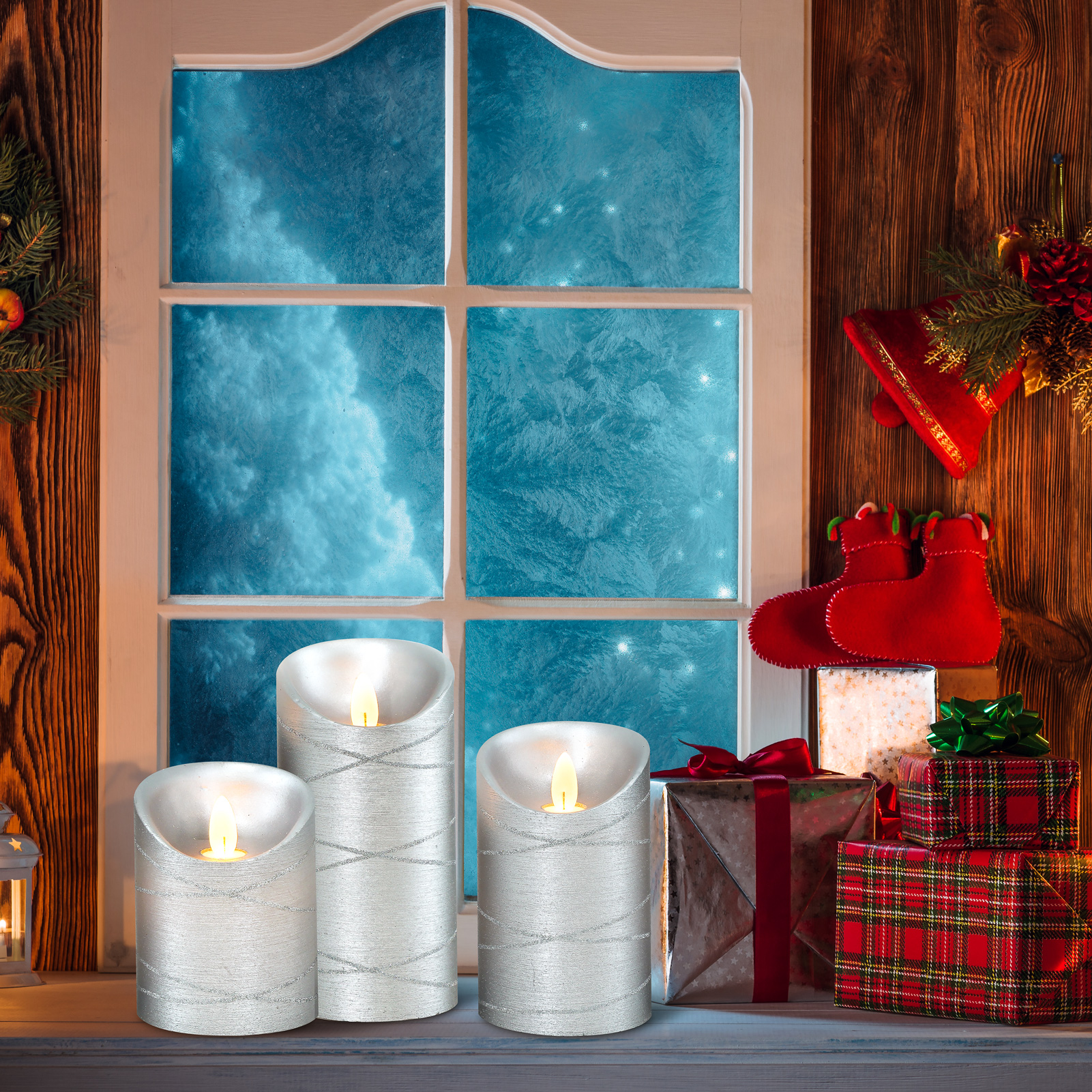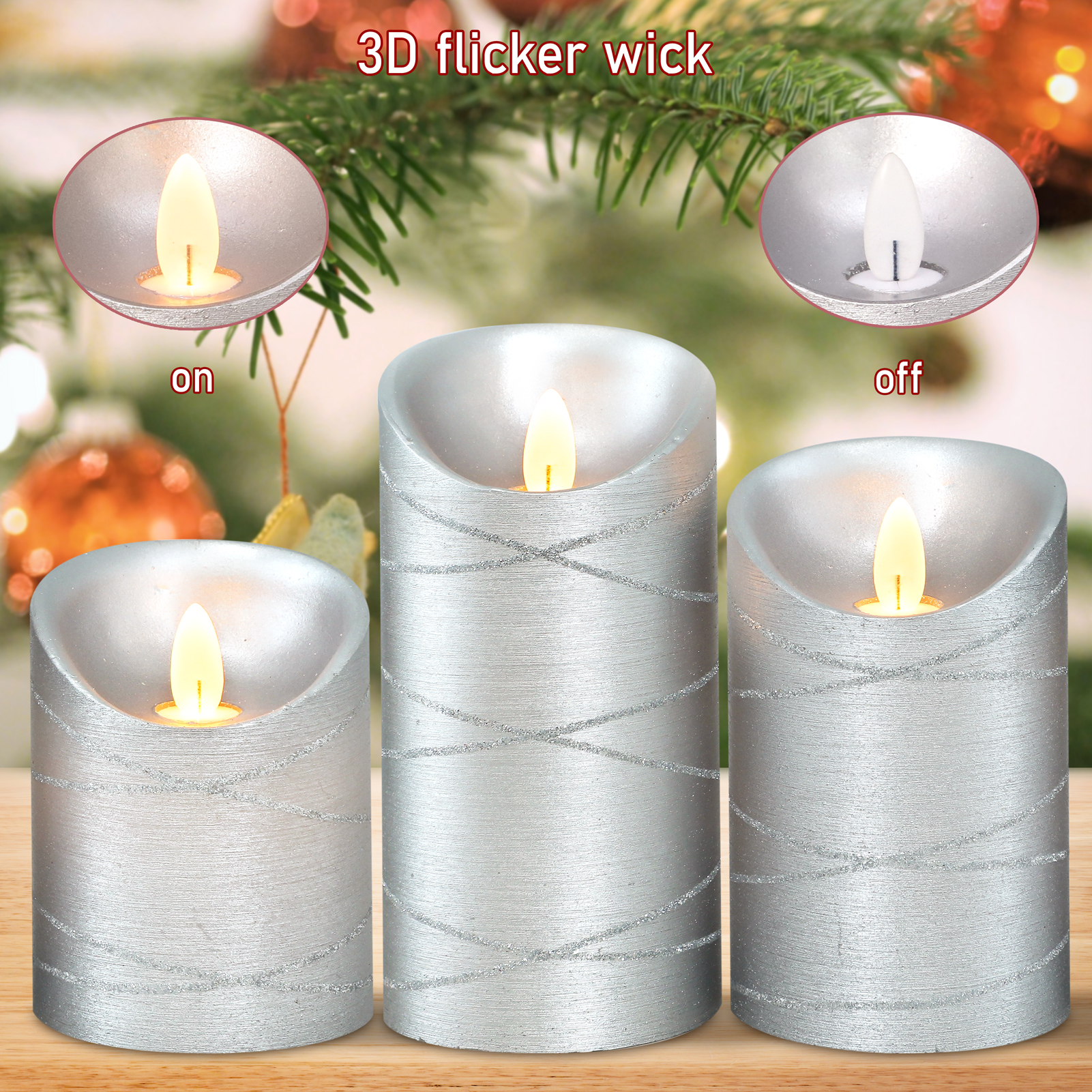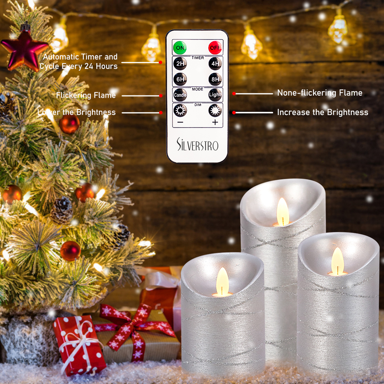 - Decorate Your Christmas with These Beautiful Flameless Candles – Silver flameless candles are made of real paraffin wax, and the surface of the paraffin wax is evenly painted and hand-inlaid with stylish silver trims. They will add a touch of elegance to your entire home. It is perfect for Christmas parties or any event you want to add to the atmosphere.